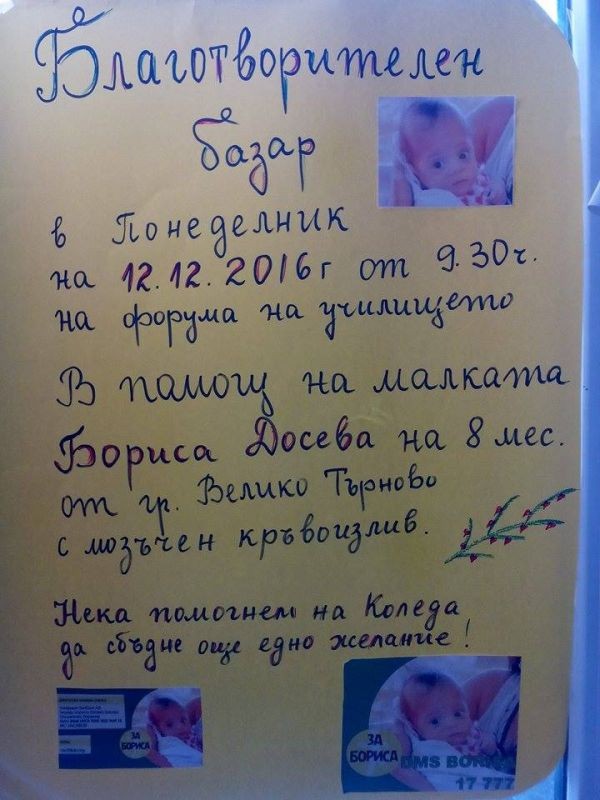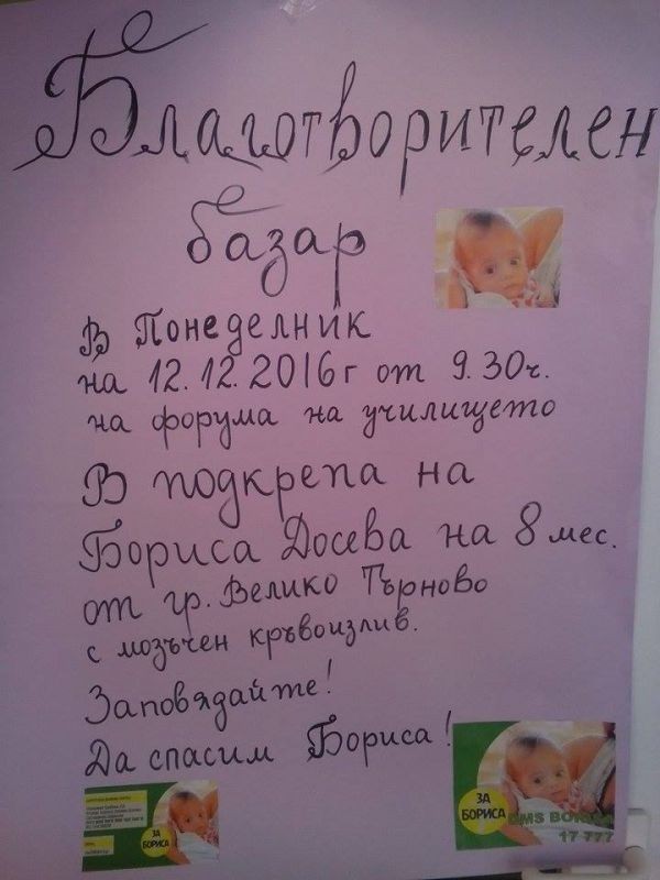 Едва на 8 месеца Бориса вече знае какво означава борба за живот. Детето е диагностицирано с тежко заболяване и се нуждае от финансови средства, за рехабилитационно лечение в Китай. За целта трябва да се подложи на лечение възможно най-скоро. За първия курс на рехабилитация, който ще трае между 4 и 6 месеца, са нужни 35 000 лв. В тази сума са включени необходимите изследвания, медикаменти, процедури, транспорт и престой в Китай. След като премине първия етап от лечението, докторите ще могат да преценят от колко още курса ще има нужда.