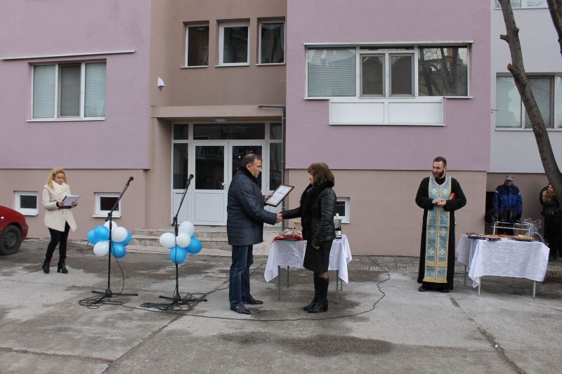 Кметът Грозев връчи на Славия Митева от сдружението на собствениците Грамота „Образцов дом“. Тя от своя страна благодари и подари на кмета символичен ключ за санираните апартаменти.
