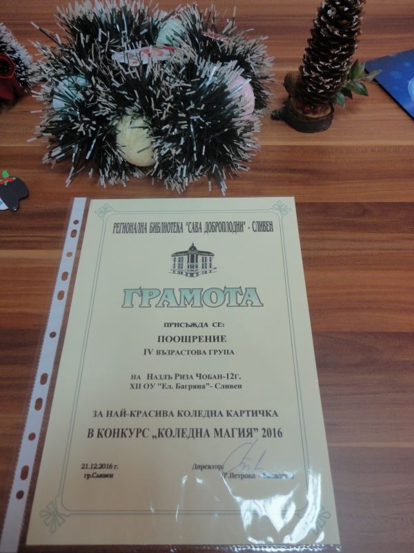 На 22.12.2016 г. в Регионална библиотека „Сава Доброплодни” – град Сливен се осъществи церемонията по награждаването на участниците в конкурса „Коледна магия”, за най-красива коледна картичка.