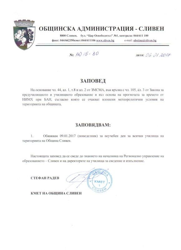 Със заповед № РД-15-80/06.01.2017 г. на кмета на Община Сливен 09.01.2017 година /понеделник/ е обявен за неучебен ден за всички училища на територията на Община Сливен.