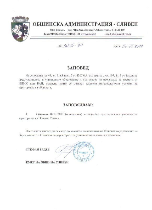 9 ЯНУАРИ 2017 ГОДИНА - НЕУЧЕБЕН ДЕН ЗА УЧЕНИЦИТЕ ОТ ОБЩИНА СЛИВЕН