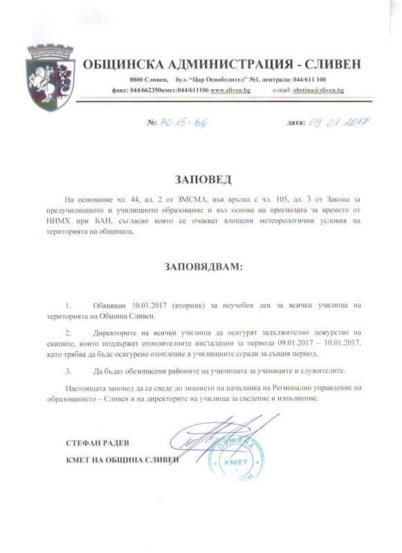 Кметът на община Сливен Стефан Радев със своя заповед № РД-15-86/09.01.2017 г. обявява 10 януари – вторник, за неучебен ден. Причината е тежката зимна обстановка и необходимостта от превантивни действия.