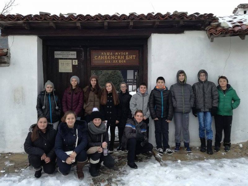 На 14.01.2017 г. , учениците от клуб „Млади възрожденци” към ОУ ”Елисавета Багряна” – Сливен, посетиха eдин от най-интересните туристически обекти в Сливен - къщата на Сливенския бит. Къща - музей "Сливенски бит" е построена през първата четвърт на ХІХ в. в една от най-старите махали на Сливен – Кафтанджийската. Тя е образец на жилищната архитектура от годините на Възраждането (XVIII-XIXв) - отворена симетрична къща с чардак. Всъщност тя представлява две къщи, залепени една за друга. По-голямата, която е построена най-напред, е известна като къщата на Паткоолу, а по-малката и по-късна, като Арнауткината. Интерес за децата предизвика откритата нова експозиция: "Традиционна култура от Сливенско", която показва съхраненото многообразие и специфика на регионалната традиционна култура. Отделено е внимание на обредната храна, обредния реквизит и вербалните магии. Показани са обредните и празнични костюми от региона. Младите възрожденци бяха впечатлени от бита и традициите на сливналии от XIX век.