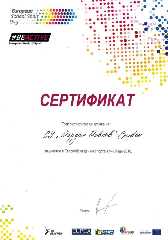 С гордост отбелязваме факта, че сме сред тринадесетте училища и детски градини в област Сливен, представили се отлично, за което сме удостоени със сертификат.