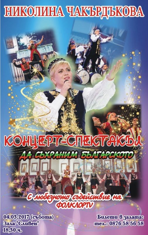 Българската народна певица Николина Чакардъкова ще изнесе концерт-спектакъл в зала "Сливен" на 4 март. Той ще премине под надслов "Да съхраним българското". Сливенци ще се докоснат до магията на българския фолклор от 18.30 часа. Билети ще се продават на касата в залата.