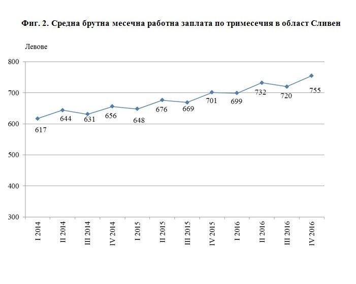 През четвъртото тримесечие на 2016 г. средната месечна работна заплата за област Сливен нараства със 7.7% в сравнение с четвъртото тримесечие на 2015 година (фиг. 2).