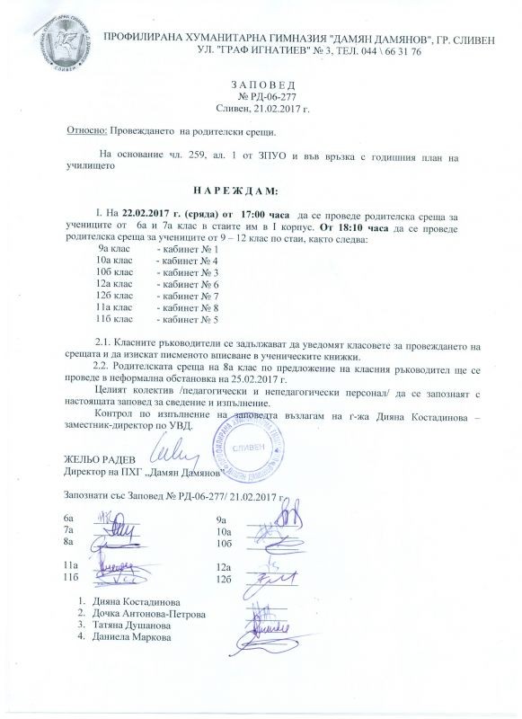 от 18:10 ч. - за родителите на учениците от 9, 10, 11 и 12 класове.