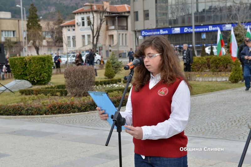 Освобождението в мислите и чувствата на бъдещото поколение на нашия град беше представено от Ралица Жекова – ученичка в 9 клас в Профилирана природо-математическа гимназия „Добри Чинтулов“ – Сливен. След това се състоя ритуал по полагане на венци и цветя в памет на героите, отдали живота си за Освобождението на България. Венци и цветя в знак на признателност бяха поднесени от кмета Стефан Радев, от евродепутата Мария Габриел, от областния управител Татяна Петкова, от председателя на Общинския съвет Димитър Митев, от директора на Областна дирекция на МВР -Сливен - старши комисар Чавдар Божурски, от директора на Териториална дирекция на ДАНС - Николай Чиликов, от началника на Регионално управление на образованието - д-р Бисерка Михалева, от държавните служители на управлението и представители на Министерство на образованието и науката, от институции, организации, учебни заведения, политически партии и граждани.