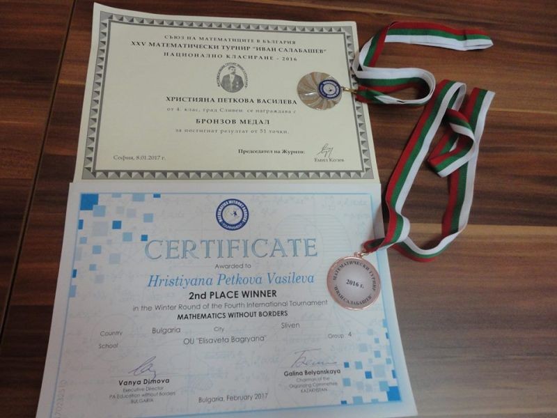 Християна Василева от 4"в" клас от ОУ "Елисавета Багряна" е със сребърен медал от международното състезание "Математика без граници".