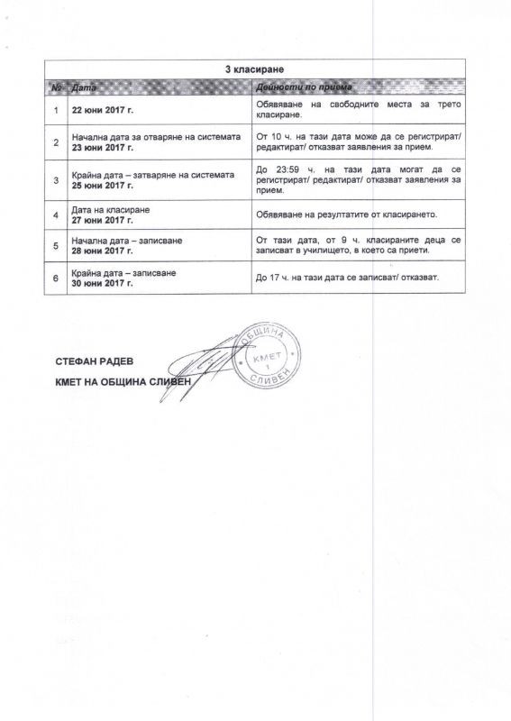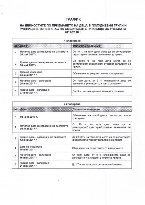 Представяме на вашето внимание графика на дейностите по приемане на ученици в първи клас на общинските училища за учебната 2017/2018 година.