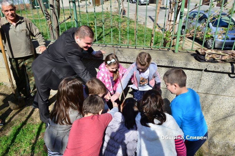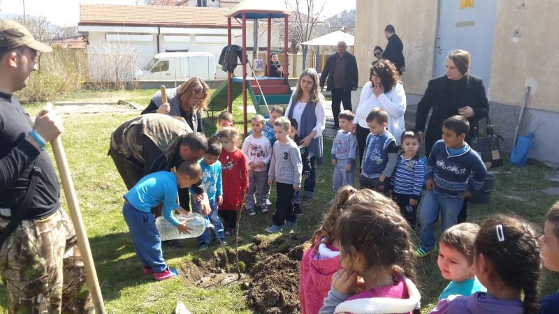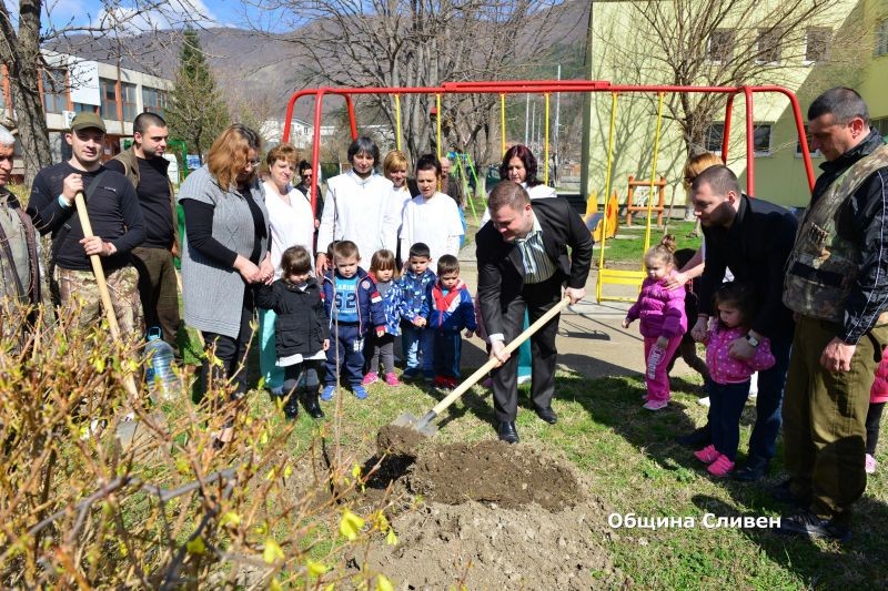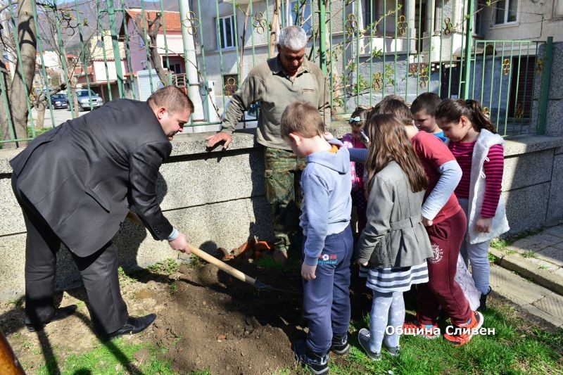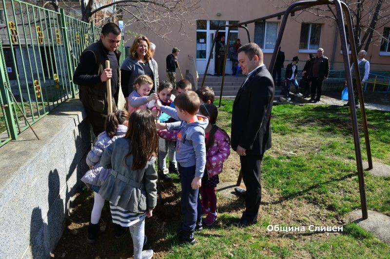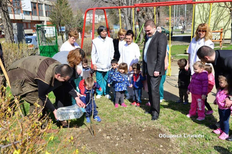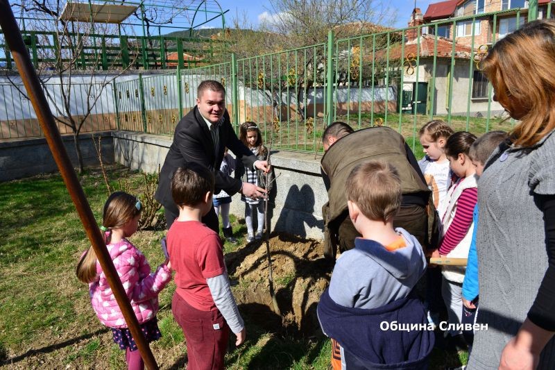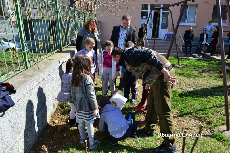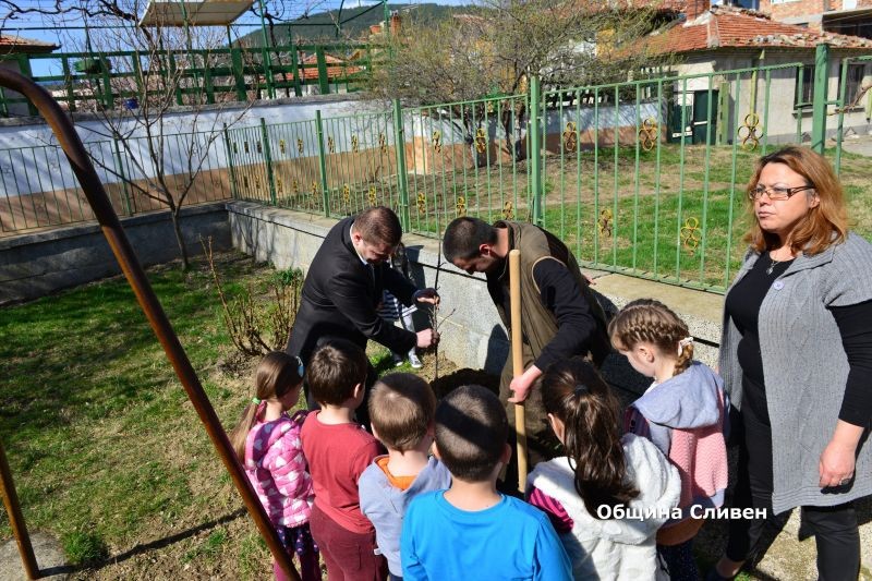 По инициатива на общинското предприятие /ОП/ „Земеделие, гори и водни ресурси” деца от детски градини и заместник-кметът Румен Иванов засадиха дръвчета в дворовете на две детски заведения в Сливен за Първа пролет.