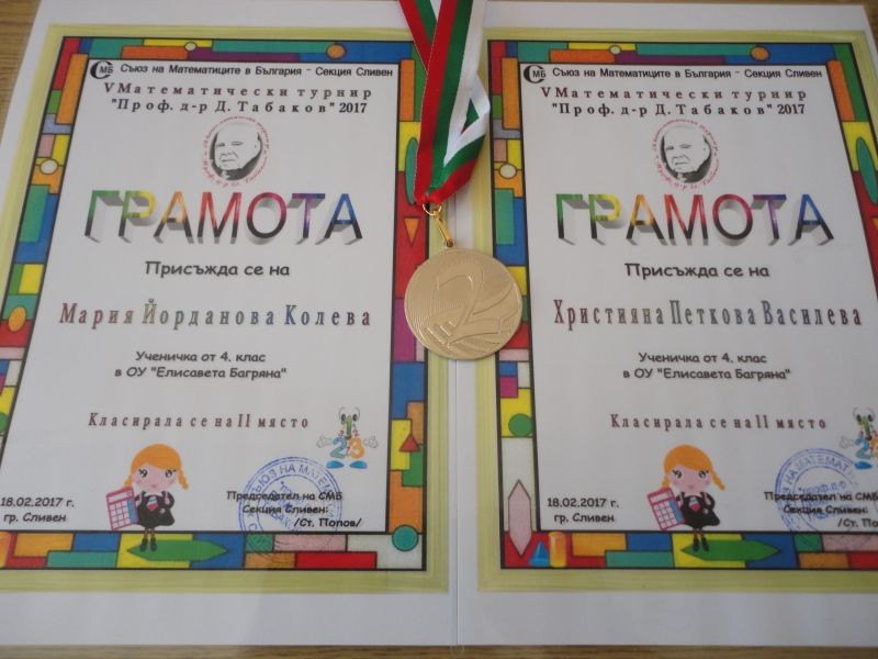 Християна Петкова и Мария Колева от IV „в” клас се класираха на второ място на V Математически турнир „Димитър Табаков”.