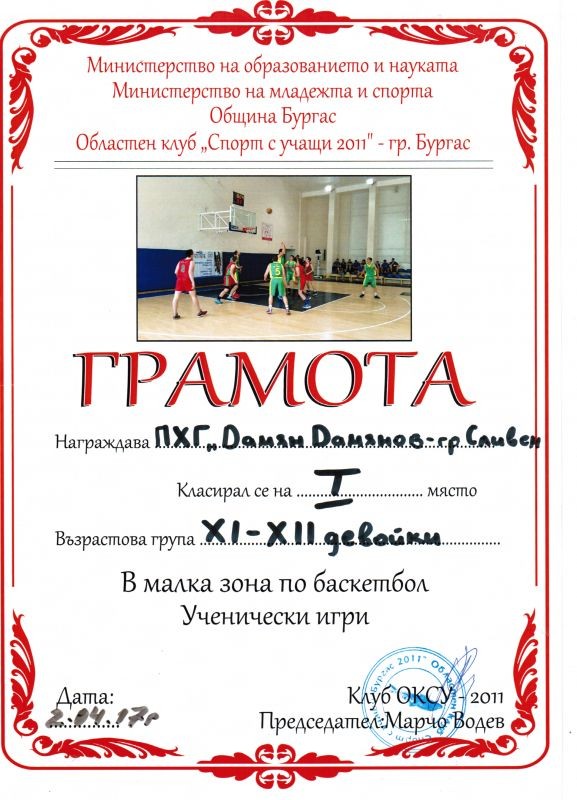 На 2 април в Бургас се проведе зонален турнир по баскетбол. Нашият отбор във възрастова група XI-XII клас спечели убедителна победа и се класира за републиканско първенство. Поздравяваме момичетата от отбора и техния ръководител Марин Маринов и им пожелаваме още успехи в първенството!