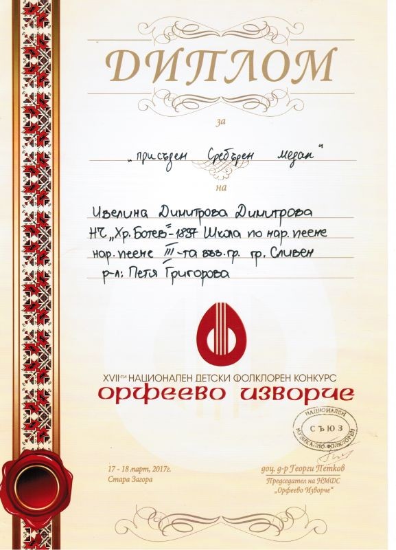 Ивелина Димитрова, ученичка от VIа клас в ПХГ „Дамян Дамянов”, се класира на I място в XVII-я национален детски фолклорен конкурс „Орфеево изворче”, който се проведе на 17 и 18 март в гр. Стара Загора. В трета възрастова група, където участва нашето момиче, сили премериха повече от хиляда талантливи деца.