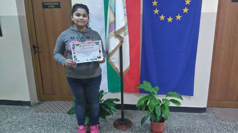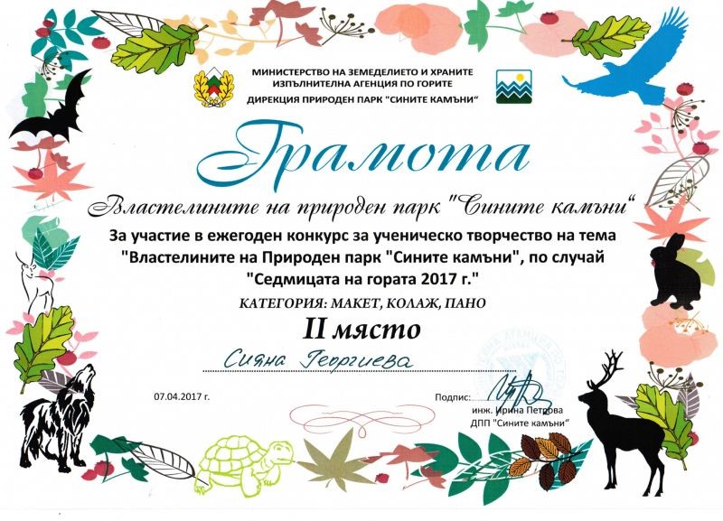 Сияна Георгиева, ученичка от VIа клас, се класира на второ място в ежегодния конкурс за ученическо творчество с природозащитна тематика, организиран от Дирекцията на Природен парк „Сините камъни” в категория Макет, колаж, пано. Тази година темата на конкурса беше „Властелините на Природен парк „Сините камъни”.