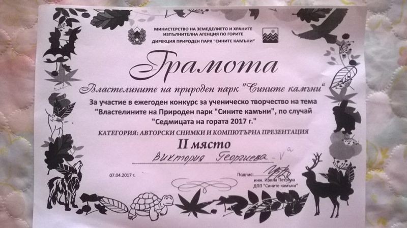 Габриела Енчева и Самуил Тодоров от 1 „в” клас заедно с г-жа Мери Божкова направиха пано и участваха в конкурса за ученическо творчество на тема "Властелините на Природен парк "Сините камъни" по случай "Седмицата на гората 2017г."