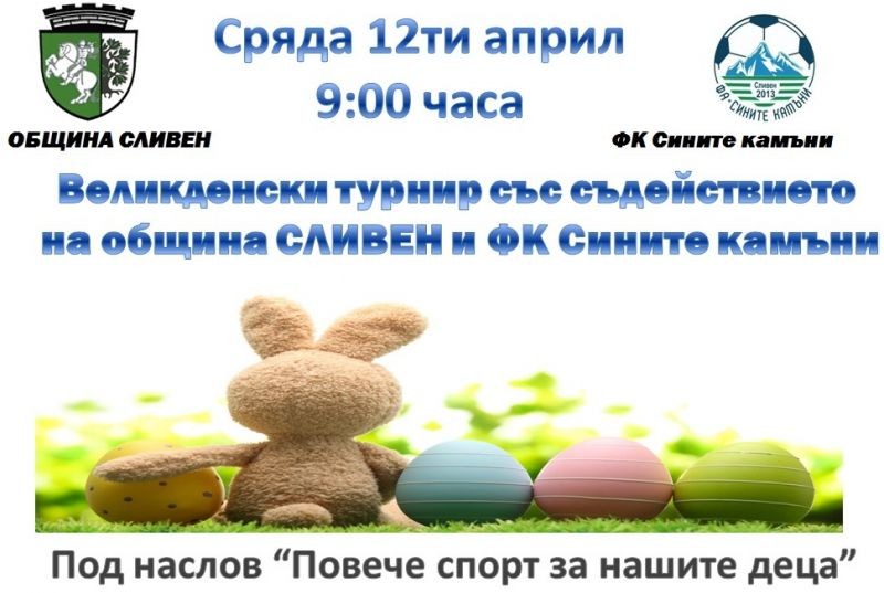 Футболен турнир за деца по случай светлия християнски празник Великден ще се състои на 12 април в Сливен. Той се организира от Общината и Футболен клуб "Сините камъни 2013". В проявата ще вземат участие деца, родена след 1 януари 2008 година, от градовете Сливен, Ямбол, Стара Загора и Бургас.