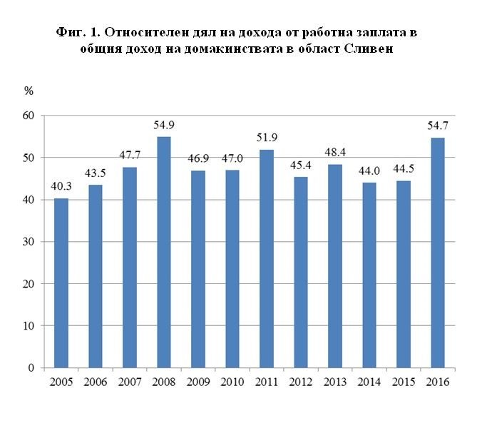 В номинално изражение доходът на домакинствата от работна заплата в област Сливен се увеличава. През 2016 г. домакинствата са разполагали средно на лице с 2 016 лв., получени от работна заплата, а през 2015 г. тези средства са възлизали на 1 885 лв., т.е. доходът от работна заплата се е увеличил с 6.9%.