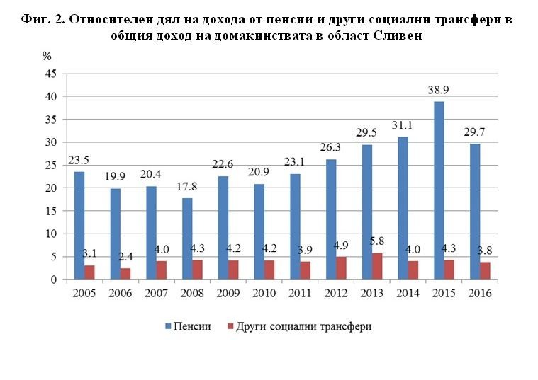 През 2016 г. пенсиите продължават да са втория по значимост източник на доходи за домакинствата в областта. Те формират 29.7% от общия доход на домакинствата, докато през 2015г. техният дял е 38.9%. Общо социалните трансфери (пенсии, семейни добавки за деца, социални помощи, стипендии и обезщетения при безработица) формират 33.5% от общия годишен доход на лице от домакинство през 2016 г., а през 2015 г. този дял е 43.2%.