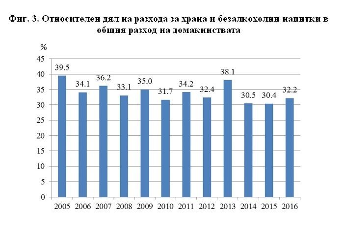 За храна са изразходвани 1 122 лв. средно на лице от домакинство. Относителният дял на разходите за храна от общия разход се увеличава от 30.4% през 2015 г. на 32.2% през 2016 година.