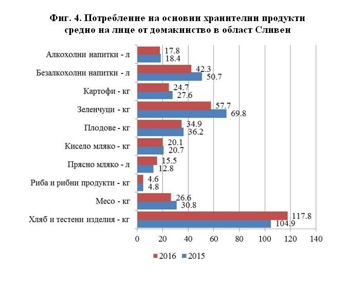 През последната година домакинствата в област Сливен намаляват консумацията на зеленчуци - пресни и замразени с 12.1 кг, като тя достига 57.7 кг средно на лице за годината. Известно понижение се наблюдава при консумацията на яйца. Потреблението на яйца се е понижило с около 11 броя и е достигнало 103 броя през 2016 година. Намалява и консумацията на безалкохолни напитки от 50.7 л през 2015 г. до 42.3 л средно на лицепрез 2016 година. Намалено е и потреблението на месо от 30.8 кг на лице през 2015 г. на 26.6 кг през 2016 година.