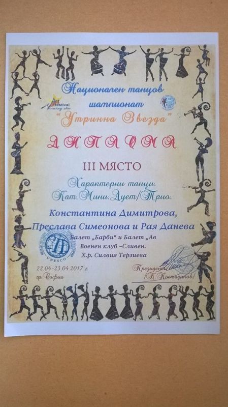 Преслава Йорданова Симеонова от I „а” клас и Рая Данева от I „в” клас при ОУ „Елисавета Багряна” взеха участие в Националния танцов фестивал „Утринна звезда” – гр. София.