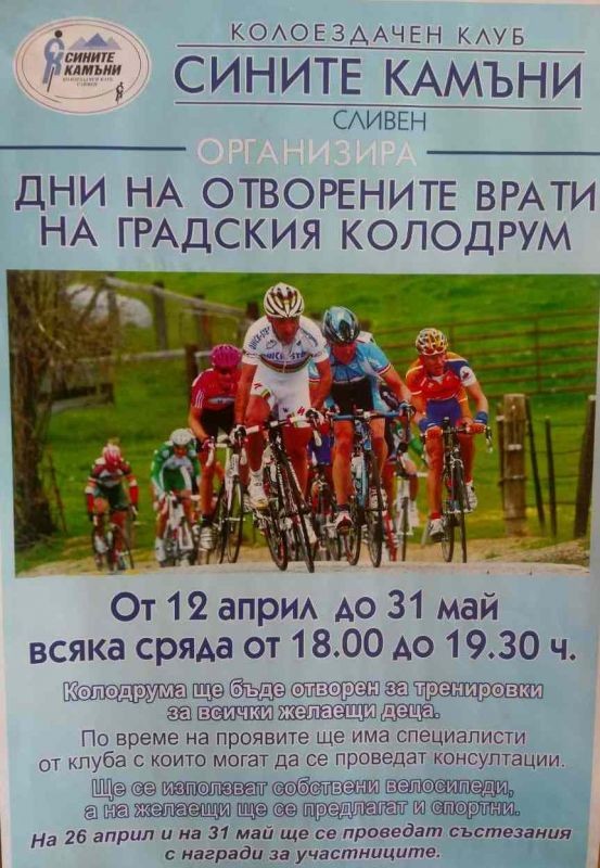 На 26 април е първото състезание по колоездене за деца, включили се в Дните на отворени врати на градския колодрум, които се провеждат всяка сряда от 18 до 19.30 часа. То се организира от Община Сливен и Колоездачен клуб "Сините камъни". Надпреварата ще започне в 18 часа. Следващото състезание ще бъде в края на месец май.