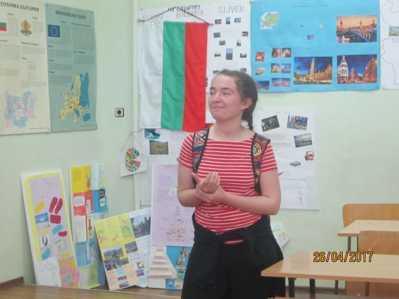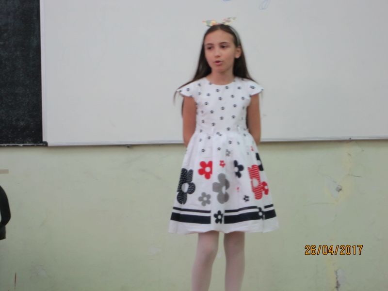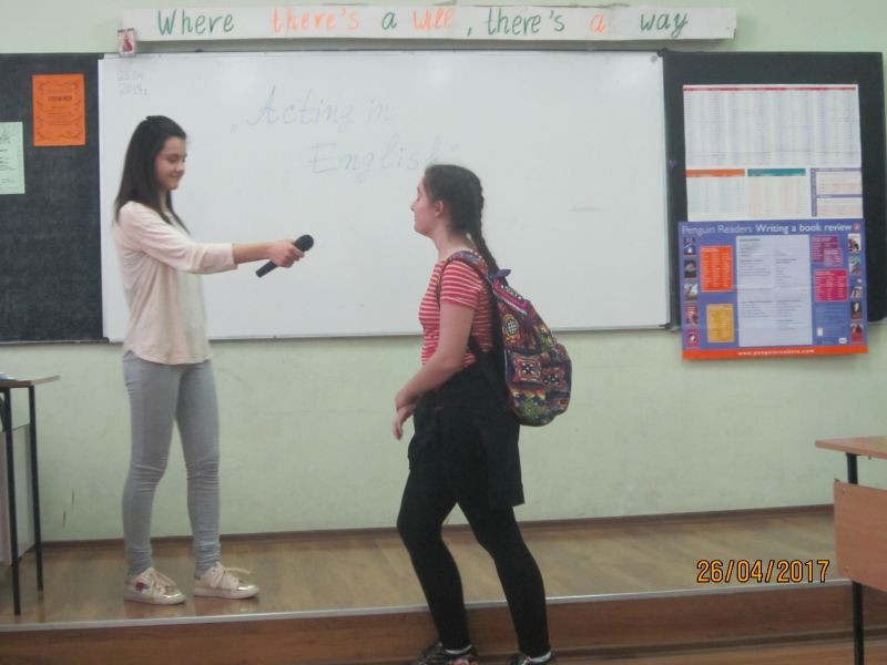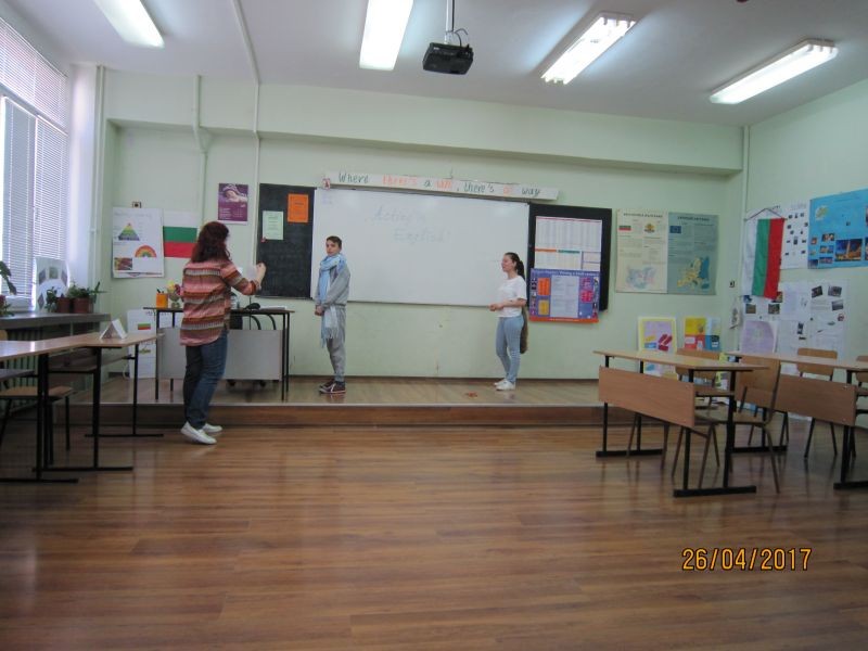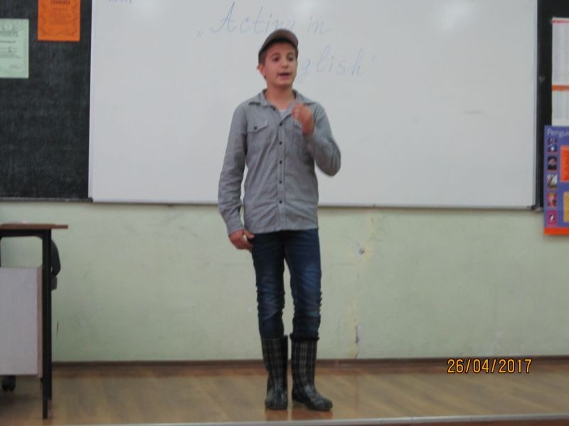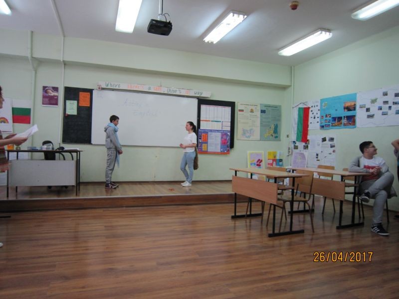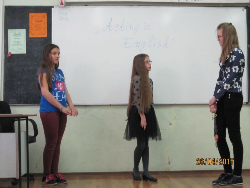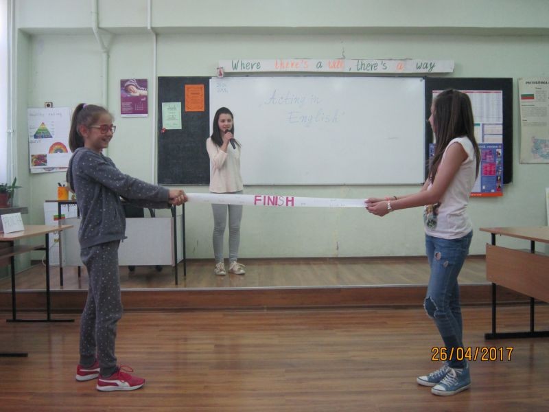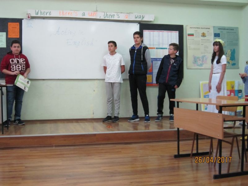 Днес 26.04.2017 г. в ОУ „Ел. Багряна“ гр. Сливен се проведе училищно състезание по английски език “Acting in English”, във връзка със седмицата посветена на Дните на Багряна и празника на училището. Участваха ученици от 4 „в”, 6 „а”, „б”, „в”, „г” класове, които представиха различни истории, кратки приказки по английски разкази и текстове.