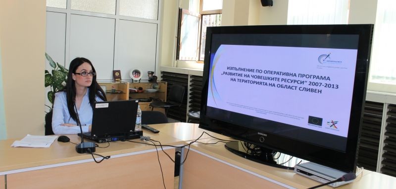 Яница Вушева - експерт „Комуникация, информация и логистика“ към Областен информационен център Сливен, представи изпълнението на ОП „Развитие на човешките ресурси“ 2007-2013 в област Сливен. Общо в Югоизточен район са изпълнени 423 проекта, от които: в област Бургас – 158, в област Стара Загора – 103, в област Ямбол – 100, а в област Сливен – 62. Разпределението по общини на изпълнените проекти в областта е както следва: община Сливен – 43 проекта (4 600 000 лв.), община Нова Загора – 11 проекта (560 000 лв.), община Твърдица – 6 проекта (540 000 лв.) и община Котел – 2 проекта (211 000 лв.).