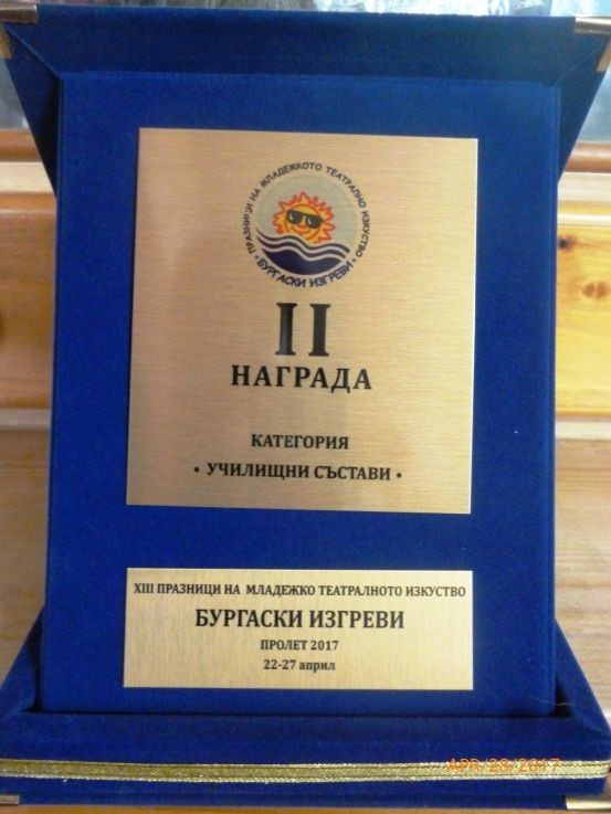 Театрална трупа «Класика» при Езиковата гимназия пожъна успехи на ХIII ПРАЗНИЦИ НА МЛАДЕЖКОТО ТЕАТРАЛНО ИЗКУСТВО „БУРГАСКИ ИЗГРЕВИ - Пролет`2017