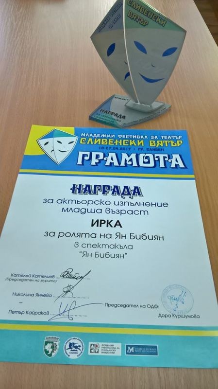 От 18.04 до 27.04. 2017 г. в град Сливен се проведе Младежки фестивал за театър. Награда за актьорско изпълнение младша възраст спечели Ирена Янева от IV „а” клас с ролята на Ян Бибиян в спектакъла „Ян Бибиян”.