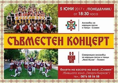Съвместен концерт на Ансамбъл за народни песни и танци - Сливен и Северняшки ансамбъл за народни песни и танци "Иван Вълев"-Плевен ще се състои на 5 юни, от 18.30 часа, в зала "Сливен". Билетите са вече в продажба и могат да бъдат закупени на касата на залата. Цена - 8 и 10 лв.