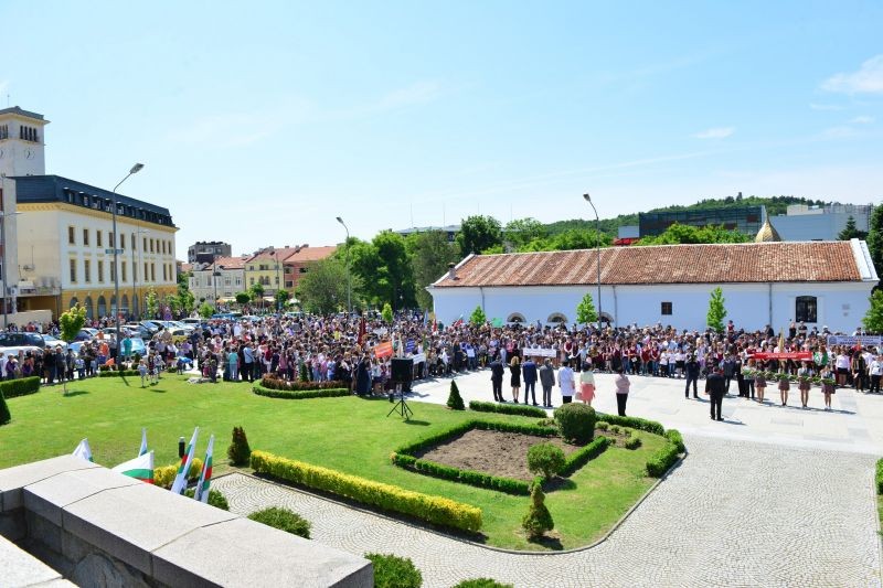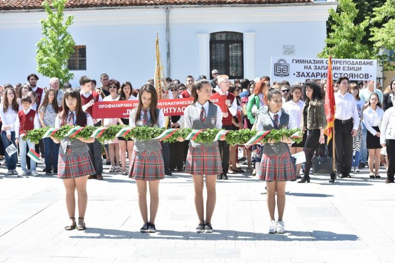 Това стана на тържествена церемония по повод празника, която се състоя днес на площад "Хаджи Димитър" и под звуците на химна на Република България, изпълнен от военен оркестър. Градският площад беше изпълнен с красиви и приветливи ученици, учители, дейци на културата, граждани, управници, които преди това преминаха в празнично шествие от Градската градина, по бул. "Цар Освободител", до паметника на войводата Хаджи Димитър.
