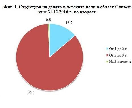 В разпределението на децата, отглеждани в детските ясли в област Сливен, по възраст към 31.12.2016 г. най-голям е делът на децата на възраст от 2 до 3 години – 85.5%, следван от дела на децата от 1 до 2-годишна възраст – 13.7%. Най-малко са децата над 3-годишна възраст – 0.8%. В края на годината в детските ясли в областта няма деца на възраст до 1 година. (Фиг. 1)