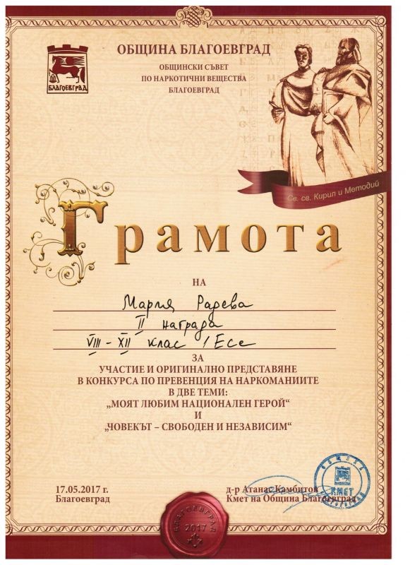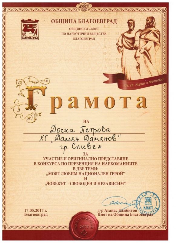 В навечерието на 24 май – Ден на българската просвета и култура и на славянската писменост, приключи конкурса по превенции на наркоманиите, организиран от община Благоевград. За оригиналната си интерпретация на темата „Човекът – свободен и независим” зрелостничката от Профилираната хуманитарна гимназия „Дамян Дамянов” Мария Радева се класира на второ място. Наградата е луксозно издание на албума ”Траките” от поредицата „Родина” на столично издателство. С грамоти за участието на Мария са удостоени и нейната ръководителка Дочка Петрова, старши учител по български език и литература и гимназията.