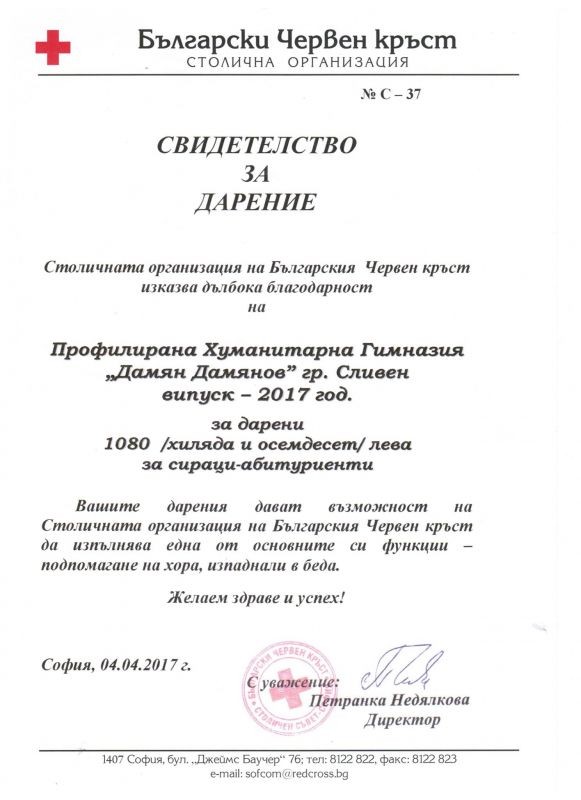 Още в началото на април момичетата и момчетата скромно и без шум дадоха знак за своята доброта и човечност като чрез столичната организация на Българския червен кръст дариха немалка сума в помощ на връстниците си без родители от страната. Това не е първият им жест на състрадателност към хората в беда. През всички изминали години в гимназията те са подпомагали различни хуманитарни каузи от национално или от местно значение. С този випуск изпращаме три от най-активните доброволки на младежката организация на БЧК в града - Цветелина, Божана и Симона. Те си отиват, но с чувство на изпълнени докрай отговорности, защото подготвиха достойна смяна - ученичките от седми клас Виктория, Таня, Пламена и Елисавета. Този млад екип на 3 май зае първо място в областното състезание по първа помощ и от 2 до 4 юни ще участва в състезанията на национално ниво в Лозен, където без съмнение ще се представи достойно.