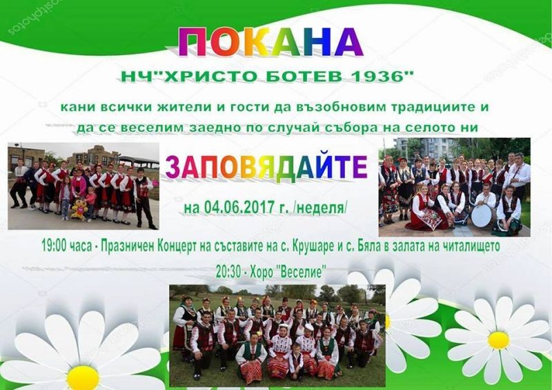 Празничен концерт в навечерието на събора на село Бяла ще се състои на 4 юни. В него ще участват танцов състав "Беленче" и самодеен състав "Олелия" при НЧ "Христо Ботев-1936", както и съставът "Пъстра броеница" - село Крушаре.