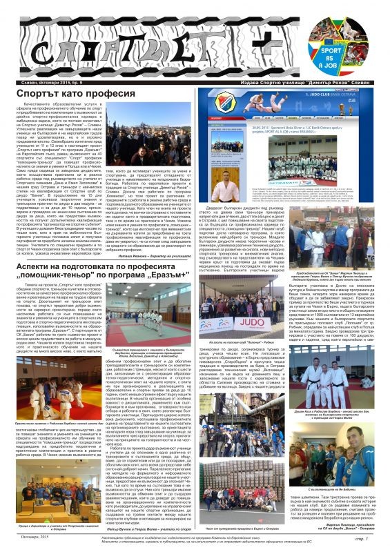 Проектът „Спортът като професия“ по програма „Еразъм+“ на Европейския съюз се осъществи през учебната 2015/2016 г. като предостави възможност на 40 спортисти със специалност "Спорт" професия "помощник-треньор" да повишат професионалните си знания и умения в Полша или в Чехия. Джудистите осъществиха практиката си в реална работна среда под ръководството на учители от Спортната гимназия „Дана и Емил Затопкови“ в Острава и треньори от Спортен клуб по джудо "Баник". Футболистите и лекоатлетите практикуваха в Спортното училище „Кристина Бохенек“ в гр. Скочов в Полша. В продължение на 15 дни учениците усвояваха теоретични знания и треньорски практики в два модула - за подрастващи и за деца до 10 години, организираха и проведоха състезания по джудо за деца, приятелски срещи по футбол, което им предостави възможността на получат допълнителна квалификация по професията "организатор на спортни събития". Учителите по специални предмети и по спорт от Чехия и от Полша споделиха своя опит с българските си колеги, усвоиха иновативни европейски практики, които да мотивират учениците за учене и спортуване, да предотвратят отпадането от училище и намаляването на младежката безработица.