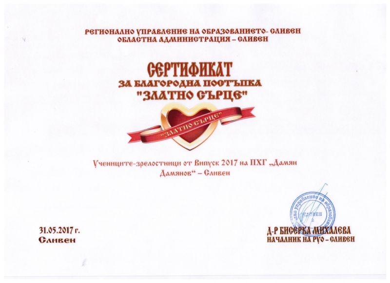 В навечерието на 1 юни – Ден на детето, със сертификат за благородна постъпка „Златно сърце” на Регионалното управление на образованието и на Областната администрация в Сливен бяха удостоени учениците-зрелостници от Профилираната хуманитарна гимназия „Дамян Дамянов”. Още в началото на април те, скромно и без шум, дадоха знак за своята доброта и човечност като чрез столичната организация на Българския червен кръст дариха немалка сума в помощ на връстниците си без родители от страната. Това не е първият им жест на състрадателност към хората в беда. През всички изминали години в гимназията те са подпомагали различни хуманитарни каузи от национално или от местно значение. Част от този випуск са три от най-активните доброволки на младежката организация на БЧК в града - Цветелина, Божана и Симона. На тях и на всички техни съученици желаем прекраснте младежки години, които им предстоят да бъдат и време за още много благородни дела.