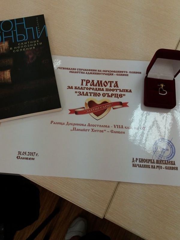 "Златно сърце" получи Ралица Апостолова от VII "а" клас, затова че дари косата си за направата на перуки за онкоболни жени и деца.