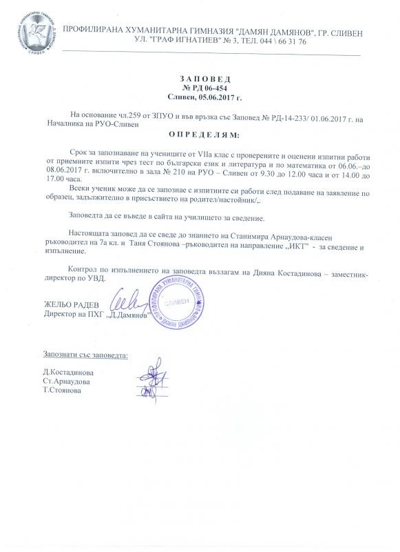 Срок за запознаване на учениците от VII а клас с проверените и оценени изпитни работи от приемните изпити по български език и литература и математика!