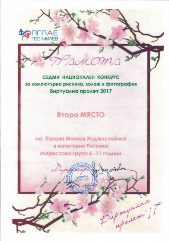 Нашият ученик от 2 „б” клас Калоян Милков Хаджистойчев спечели второ място в категория – Рисунка в Националният конкурс за компютърна рисунка, колаж и фотография „Виртуална пролет 2017”. Конкурсът е организиран от Профилирана гимназия с преподаване на английски език "Гео Милев" - град Бургас.