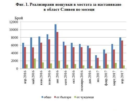 Общият брой на реализираните нощувки във всички места за настаняване през април 2017г. в област Сливен е 7 986, като се е увеличил с 20.8% в сравнение с април 2016 година. Реализираните нощувки от български граждани са 7 179 и са се увеличили с 30.1% спрямо същия месец на предходната година. Намалял е броят на реализираните нощувки от чужденци с 26.7%, спрямо април 2016 година. Най-голям брой нощувки са реализирали чуждестранните граждани от Гърция - 119, САЩ - 93 и Турция - 89.
