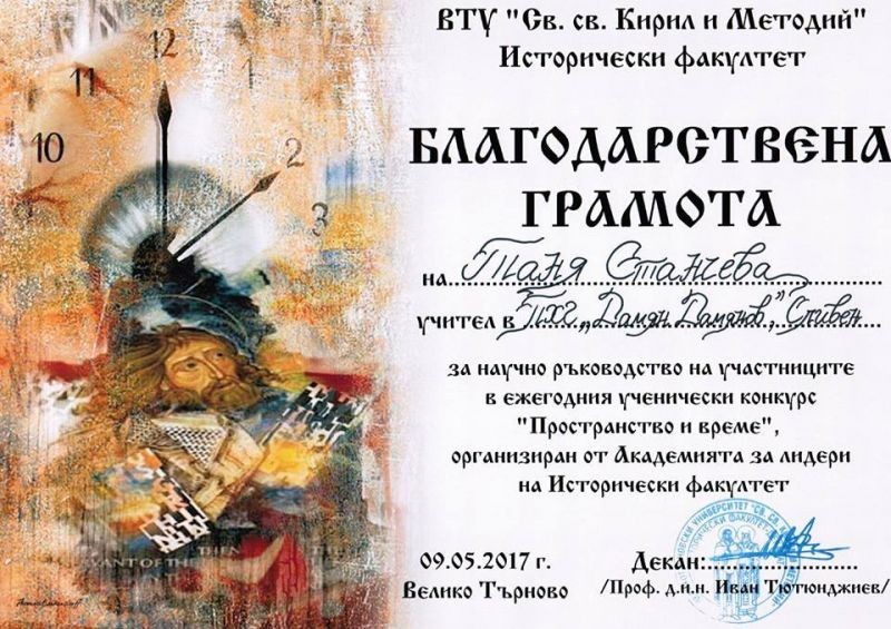 С благодарствена грамота за научно ръководство, Историческият факултет на ВТУ „Св.св. Кирил и Методий” удостоява Таня Станчева, старши учител по история и цивилизация.