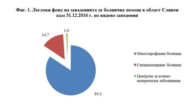 По данни на отдел „Статистически изследвания - Сливен“ на ТСБ – Югоизток заведенията за болнична помощ в област Сливен към 31.12.2016 г. са 8 с 1 021 легла (табл.1), като 7 от тях са болници с 1 011 легла. Заведенията за извънболнична помощ са 52, а другите лечебни и здравни заведения са 4 с 58 легла.