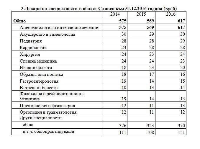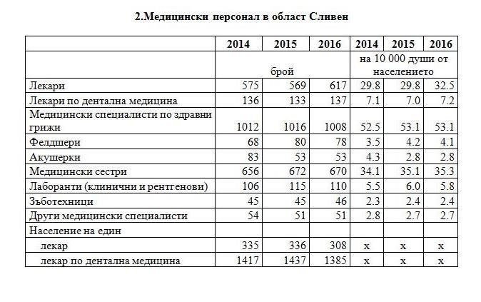 В края на 2016 г. на основен трудов договор в лечебните и здравните заведения в областта практикуват 617 лекари (табл. 2). Лекарите по дентална медицина са 137, а медицинските специалисти по здравни грижи – 1 008, като 670 от тях са медицински сестри.