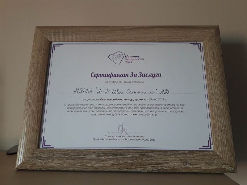 Фондация “Нашите недоносени деца” връчи сертификат за заслуги на МБАЛ „Д-р Иван Селимински“-Сливен. Сертификатът е издаден за участието на неонатологичното отделение в кампанията на фондацията по повод Световния ден на кенгуру-грижата.
