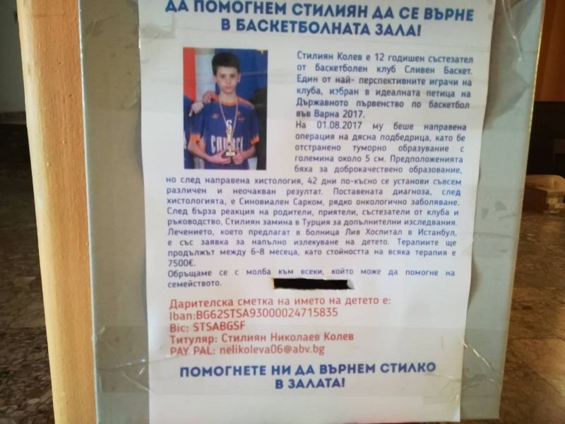 Във фоайето на централния вход на Община Сливен от днес е поставена кутия за събиране на средства за лечението на 12-годишният Стилиян Колев. Първите дарители бяха общинските съветници и общински служители. Днес Общинският съвет гласува отпускането на 2 000 лева за лечението на състезателя от баскетболен клуб „Сливен Баскет“.