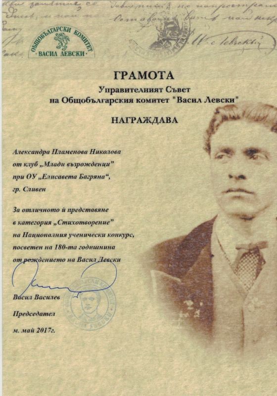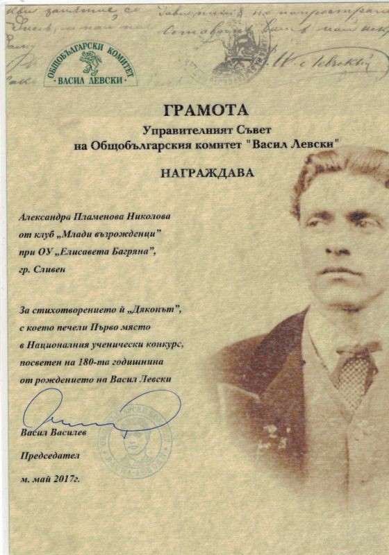 За отличното представяне в категория „Стихотворение“ на Национален ученически конкурс, посветен на 180-та годишнина от рождението на Васил Левски са отличени: