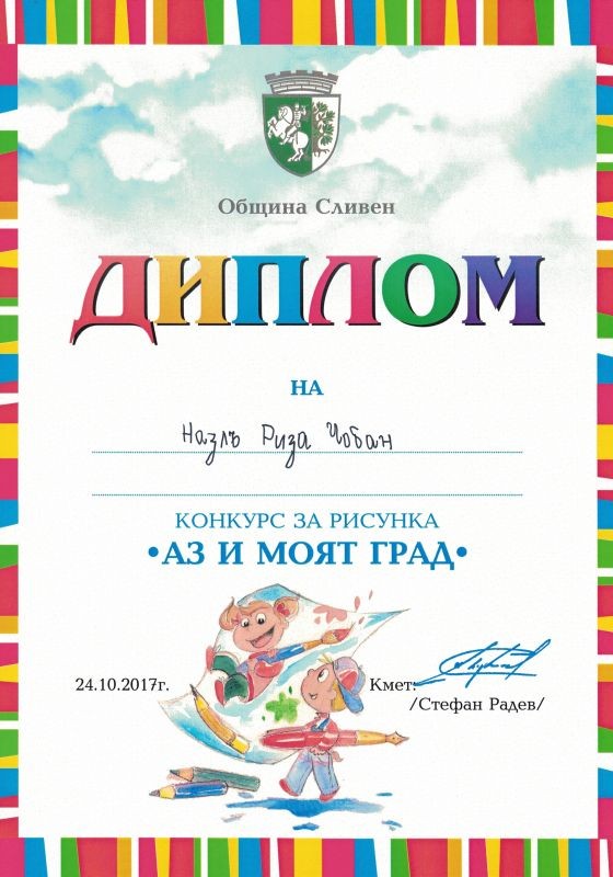 На тържествена церемония днес 24.10.2017 г. бяха наградени участниците в традиционния ученически конкурс за рисунка „Аз и моят град“. Наградите бяха връчени от заместник-кметът на община Сливен Пепа Чиликова и заместник-областният управител Димитринка Петкова.